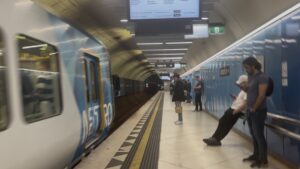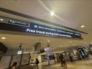 (↑電車「メルボルンセントラル」駅。‟4月は運賃無料”と書いてあります)