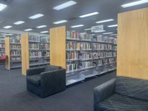 私が到着したのは13時ごろ。そんなに大きな図書館ではないのですが、駐車場には車がたくさん止まっていて、館内には人が結構いました。
